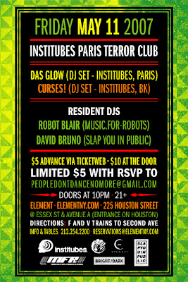 I called out from work and took it easy, but no amount of power naps, West Wing, or tequila made me feel well enough to go out for People Don't Dance No More Friday night...I watched a short video of Das Glow's set on Youtube (and know enough from personal experience that Curses! killed it) and immediately regretted my decision the next day. Fuck!